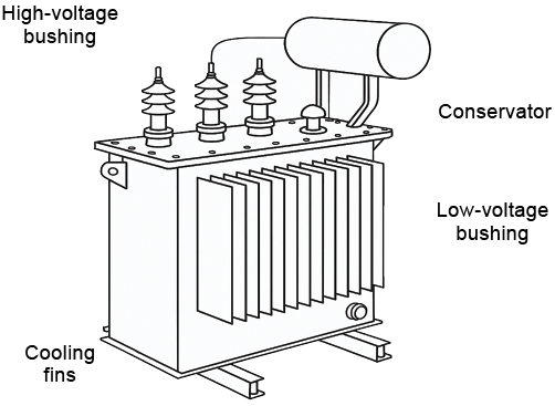 • Tank: Contains insulating oil (in oil-filled transformers)